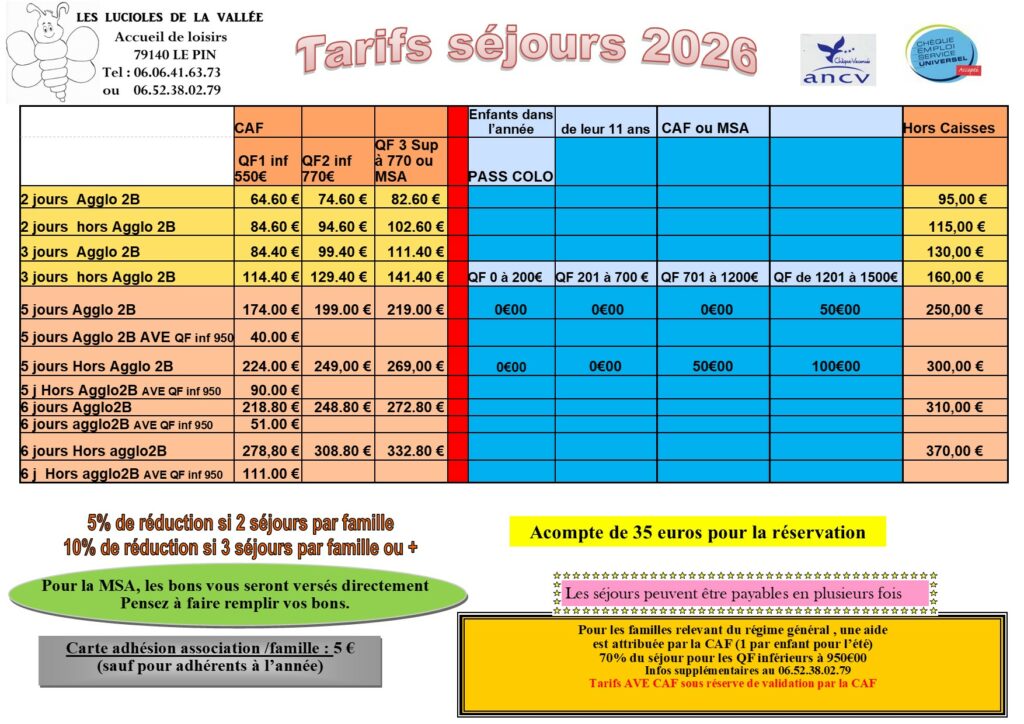 Tarifs séjours 2026