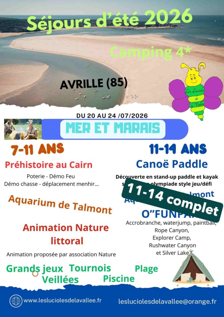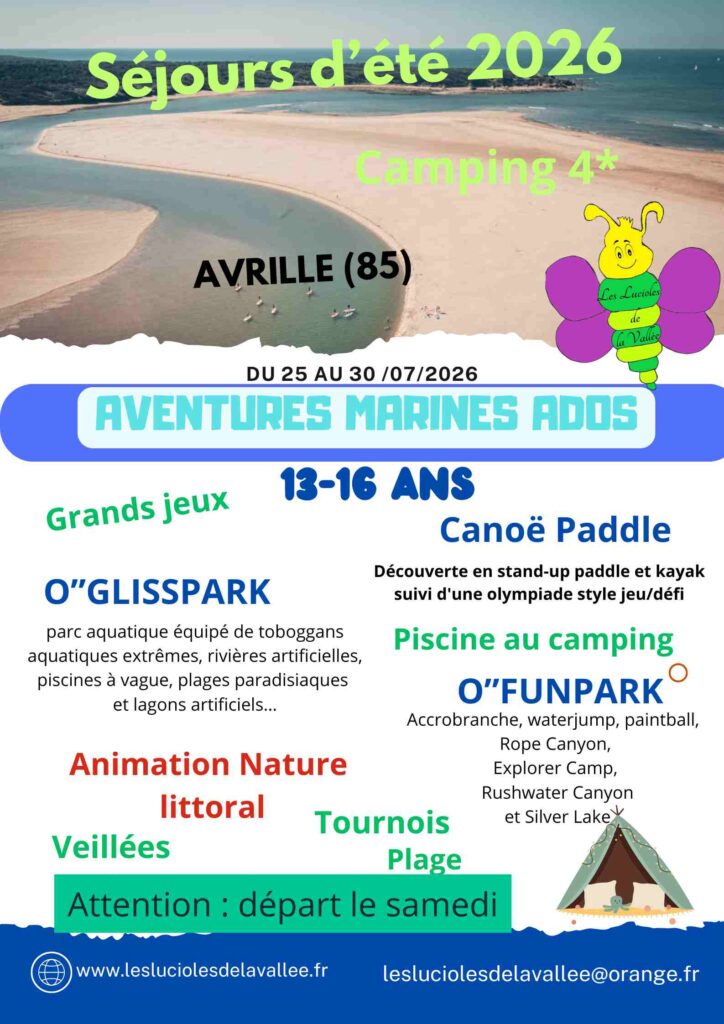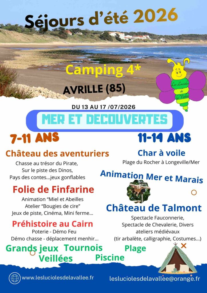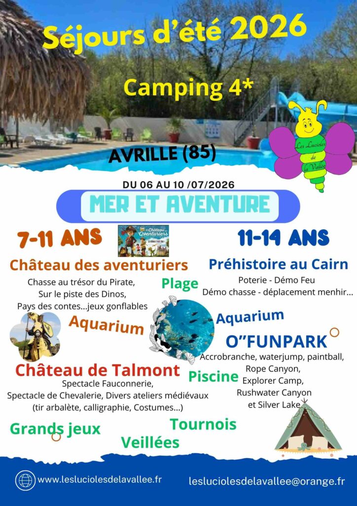 Sentez vous cet air marin… Les 3 premiers séjours auront tous lieu à Avrillé , à 10 minutes des plages de Vendée, dans un camping 4* qui accepte encore les groupes, ce qui devient difficile à trouver ! Ce camping a 1 piscine extérieure avec un toboggan et une petite piscine intérieure. Il propose aussi des animations et des soirées.